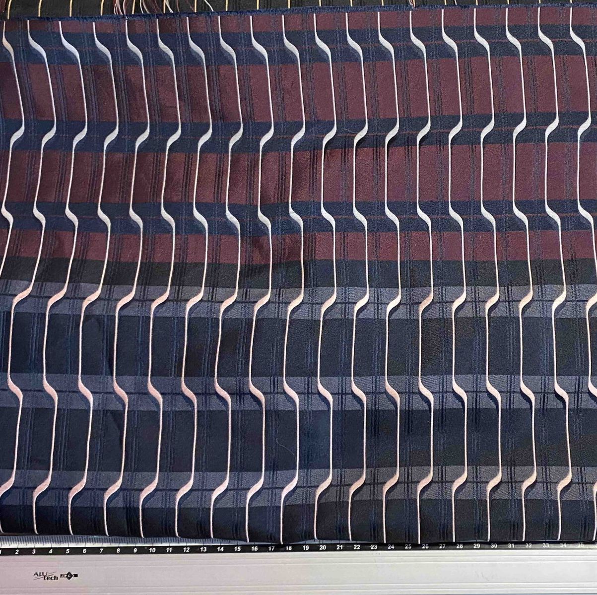Vagues géométriques, tissu jacquard. Couleurs: marine, gris & bordeaux.
