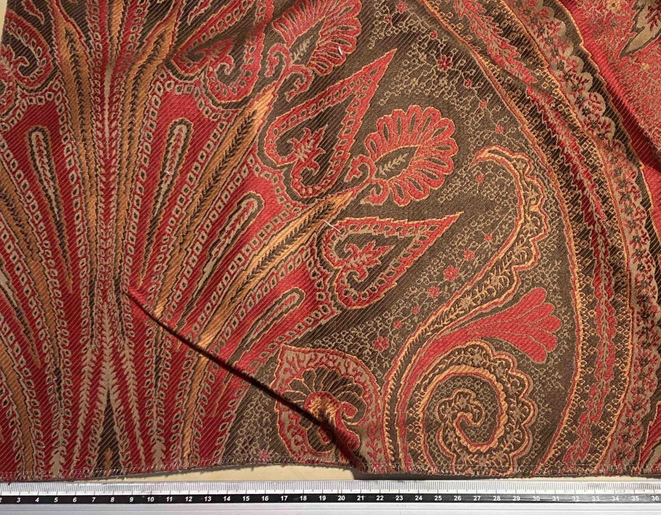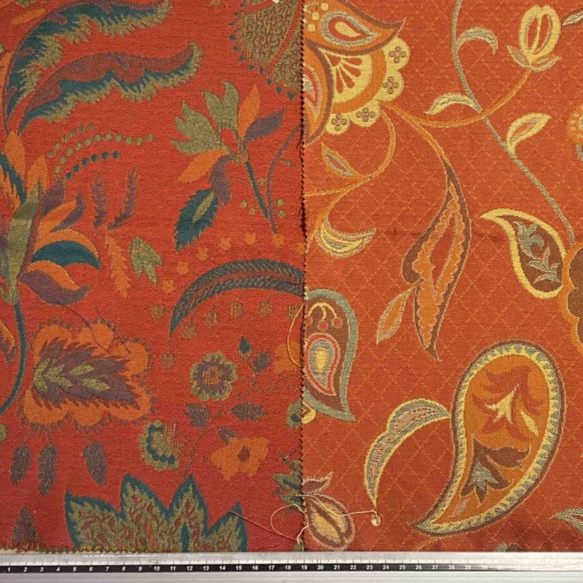 Motifs cachemires sur fond couleurs brique.