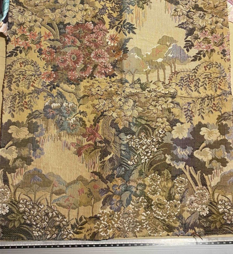 Jacquard baroques; fleurs & fruits ocres sur fond bleu canard.